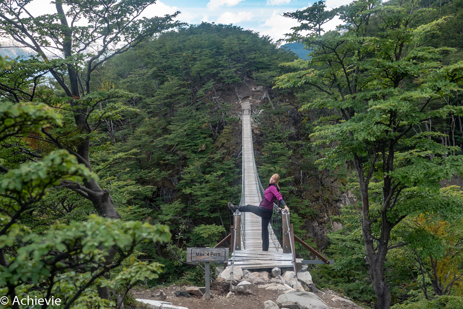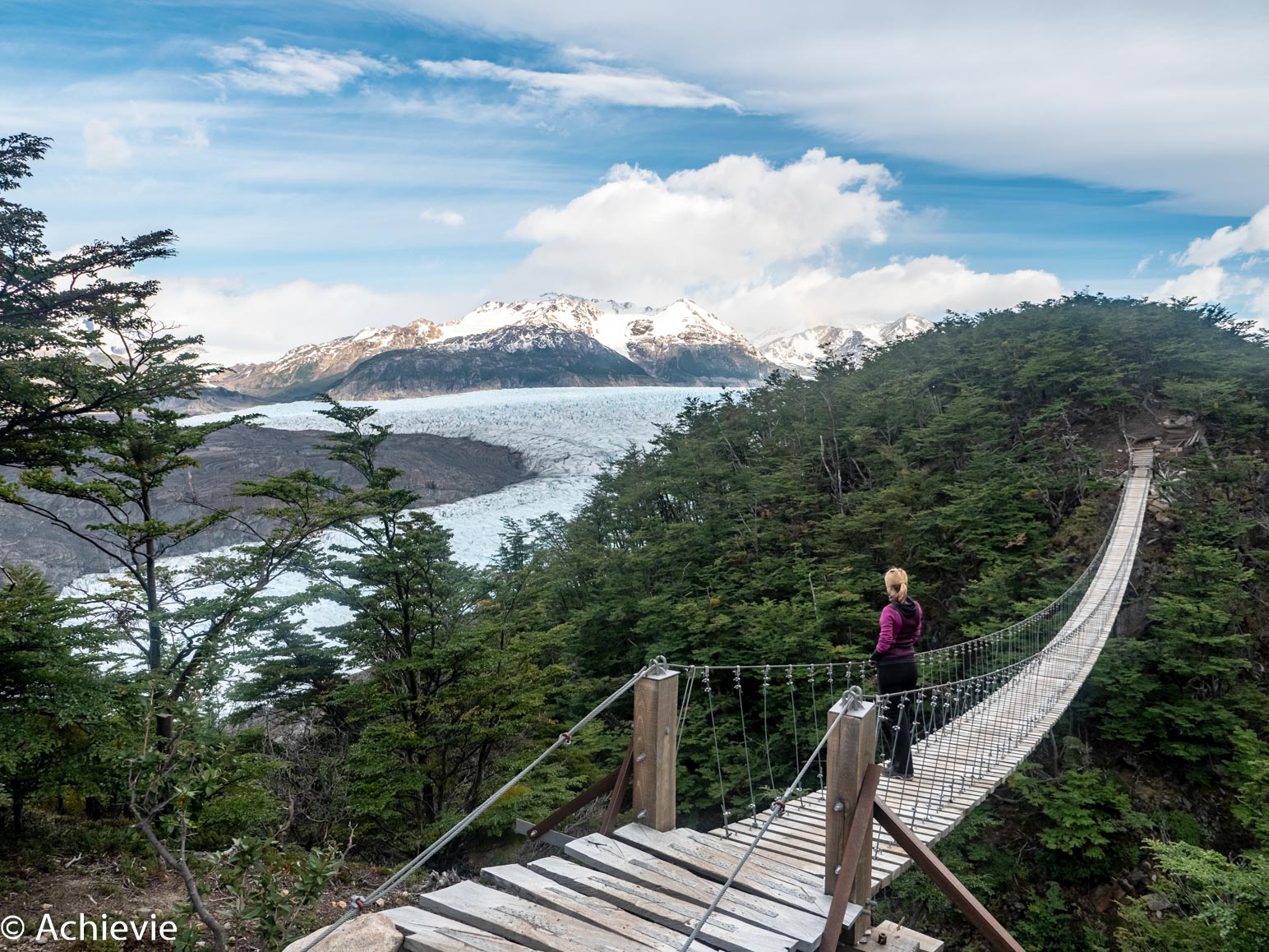 Going up, it took us about 45min to the first suspension bridge. Then 1h30 to the second suspension bridge. Then 5min to the mirador just behind the second suspension bridge and then about 30min further, you get to walk right next to the glacier field.