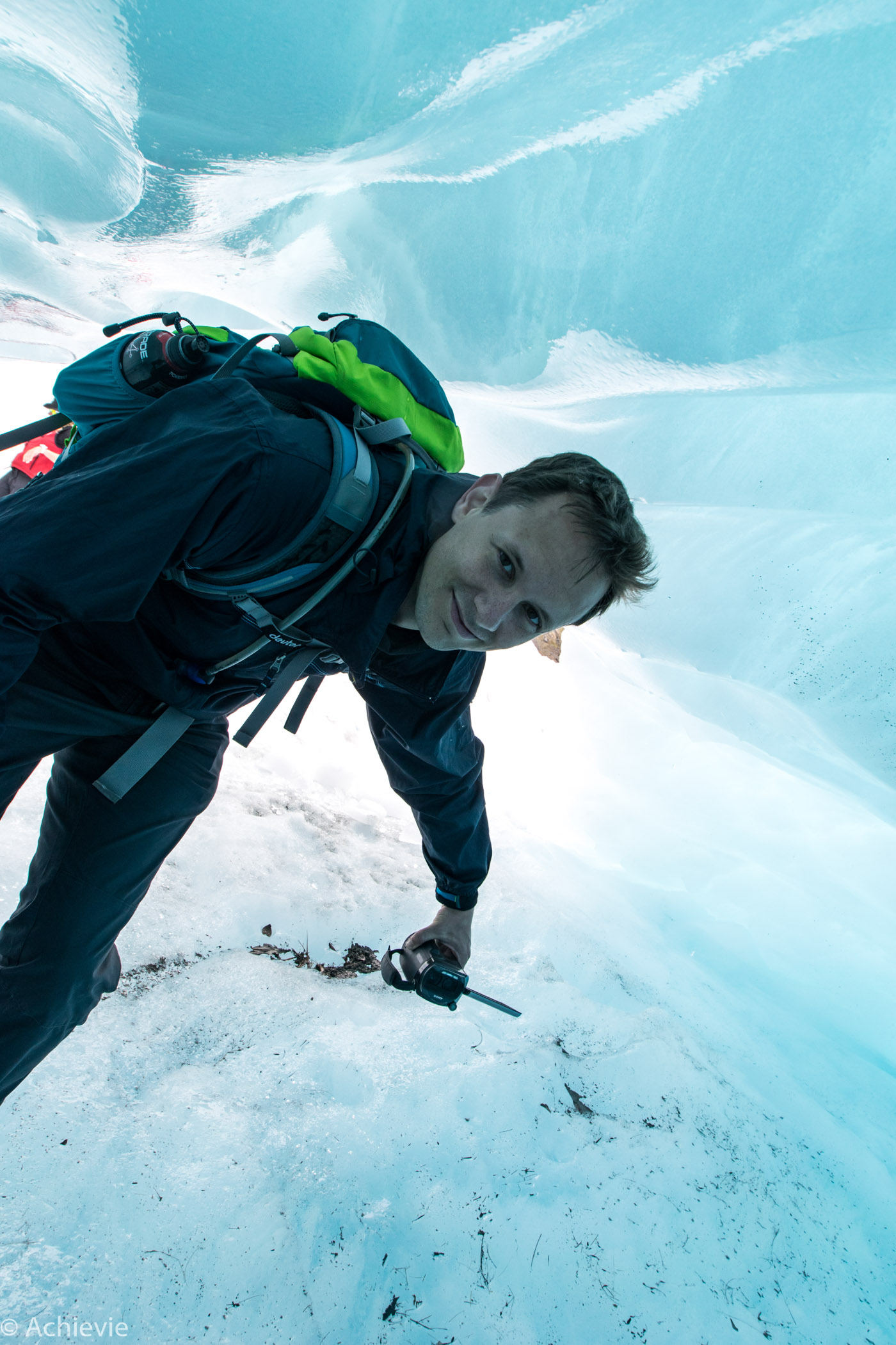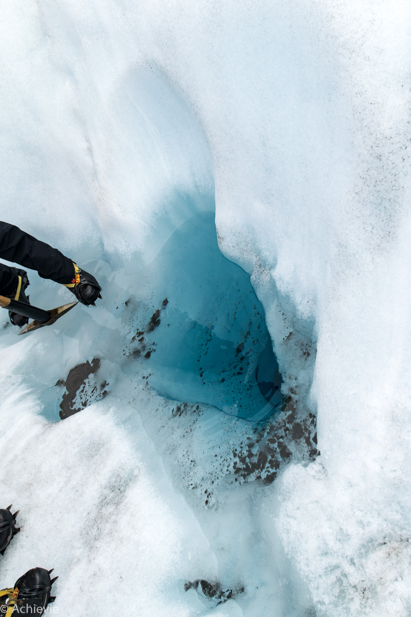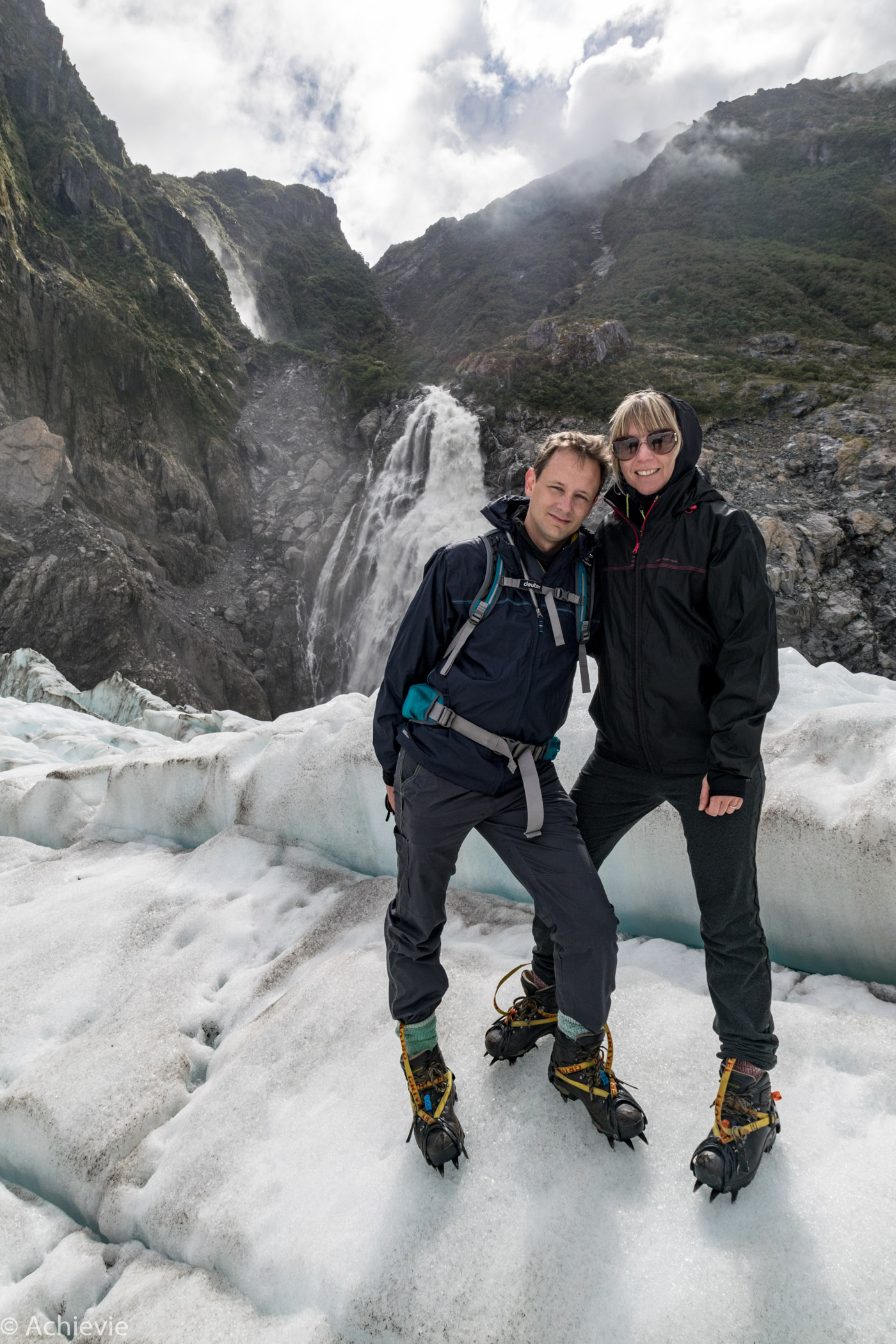 Before getting into the helicopter and onto the Glacier, we got special equipment, getting us ready for the hike. Flying into the Glacier is amazing. We were lucky with the weather. Only a few days earlier we heard from another Belgian couple they had to cancel the trip because of bad weather. When we started that morning we even had sunshine.