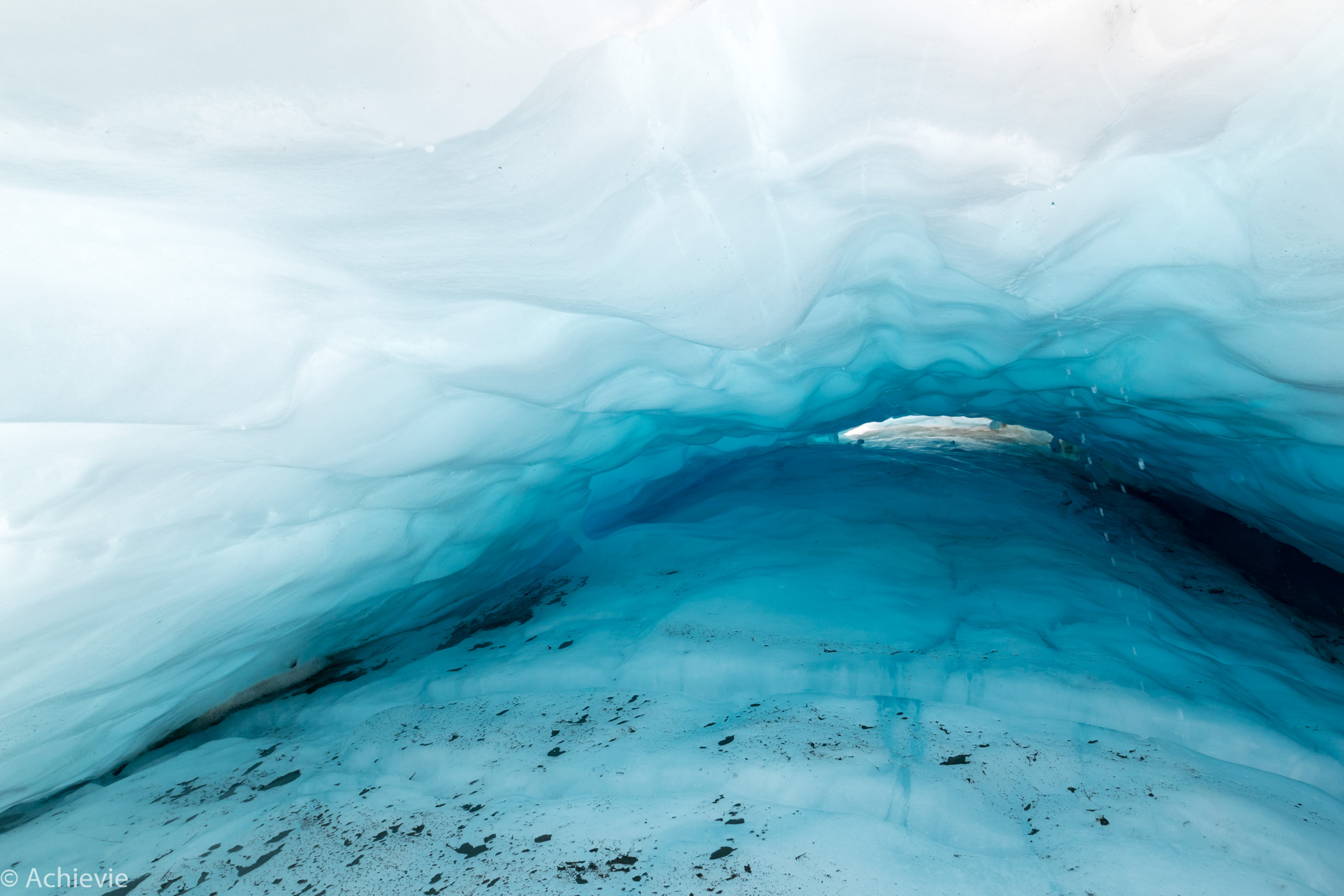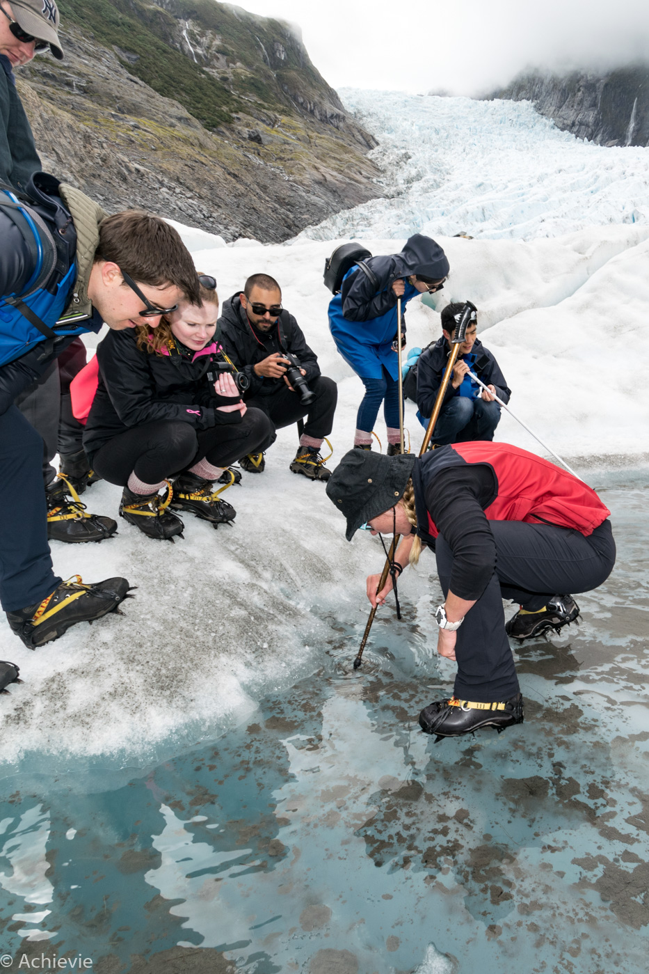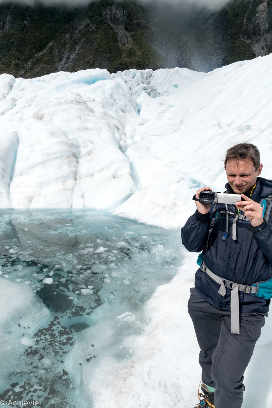 Before getting into the helicopter and onto the Glacier, we got special equipment, getting us ready for the hike. Flying into the Glacier is amazing. We were lucky with the weather. Only a few days earlier we heard from another Belgian couple they had to cancel the trip because of bad weather. When we started that morning we even had sunshine.