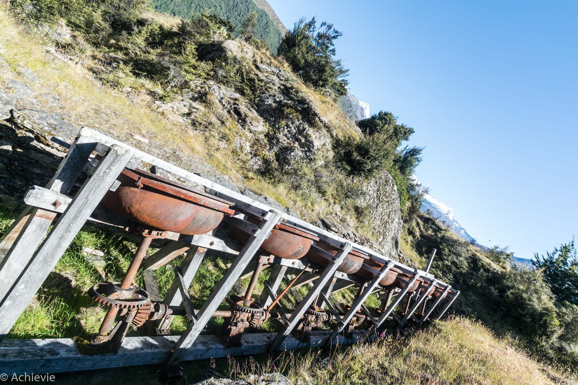 The track is part of the Otago Goldfields Park and built by miners. The sight of the remains of the water wheel and seven berdans (iron bowls) surrounded by the incredible landscape is quite unique.
