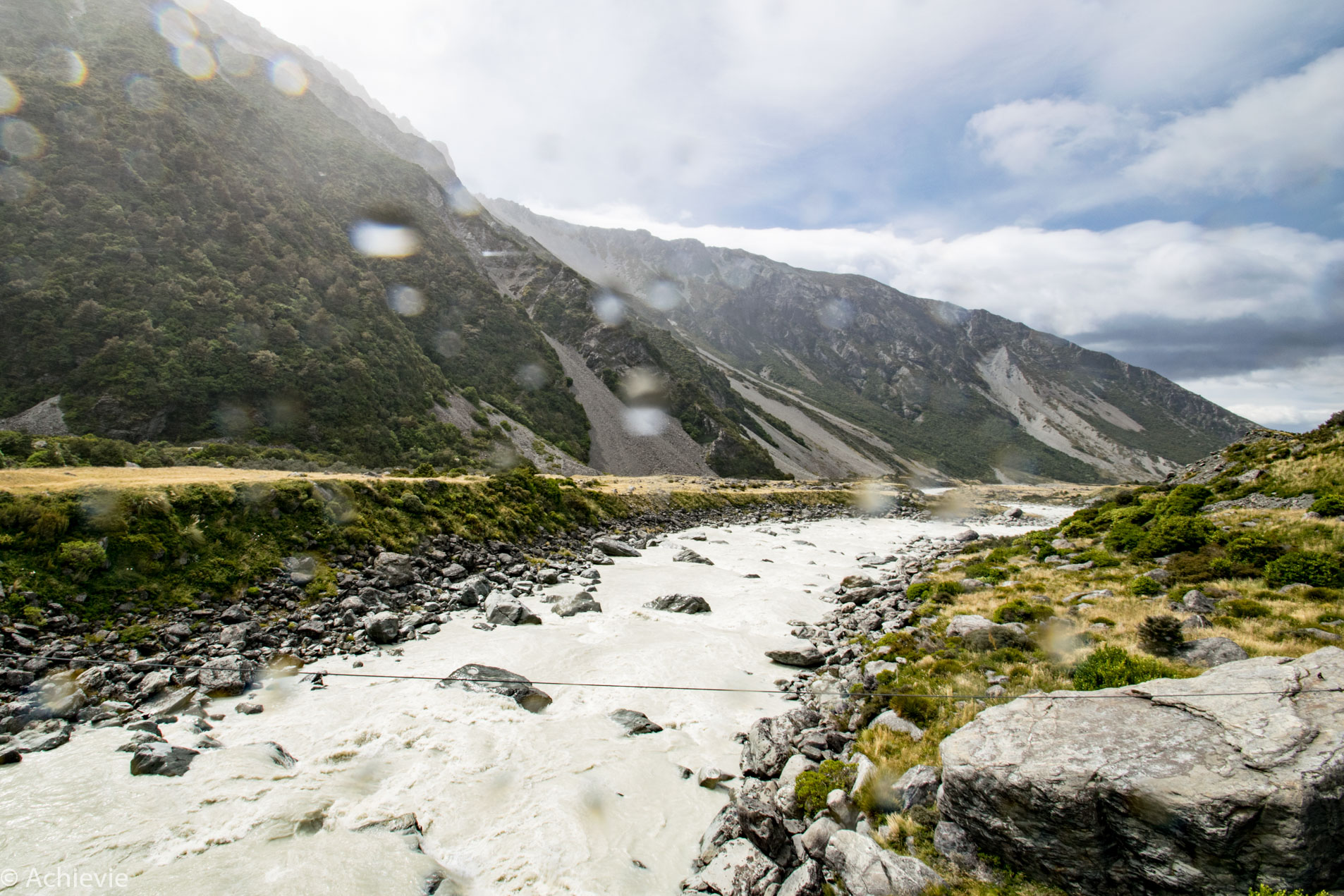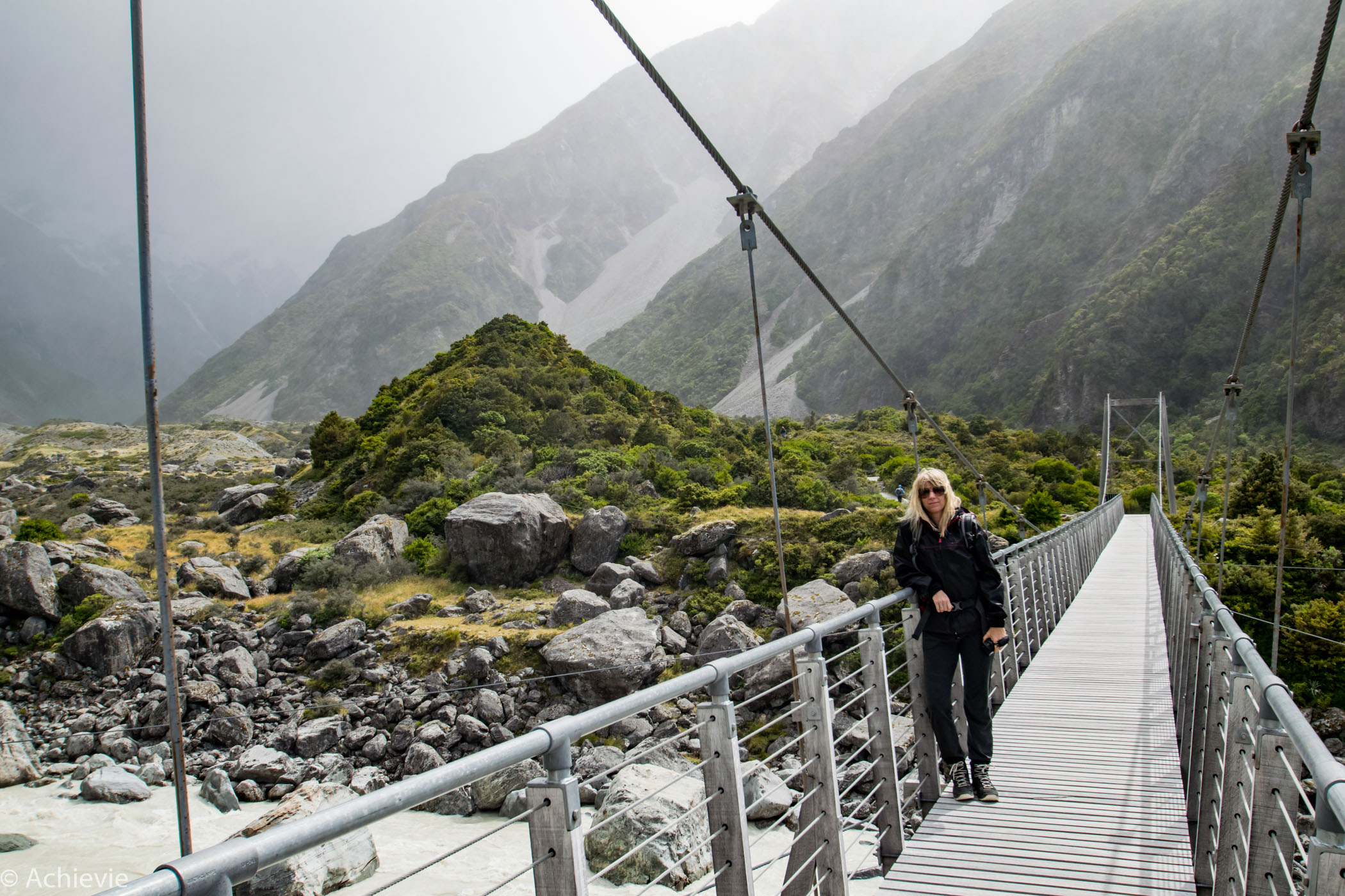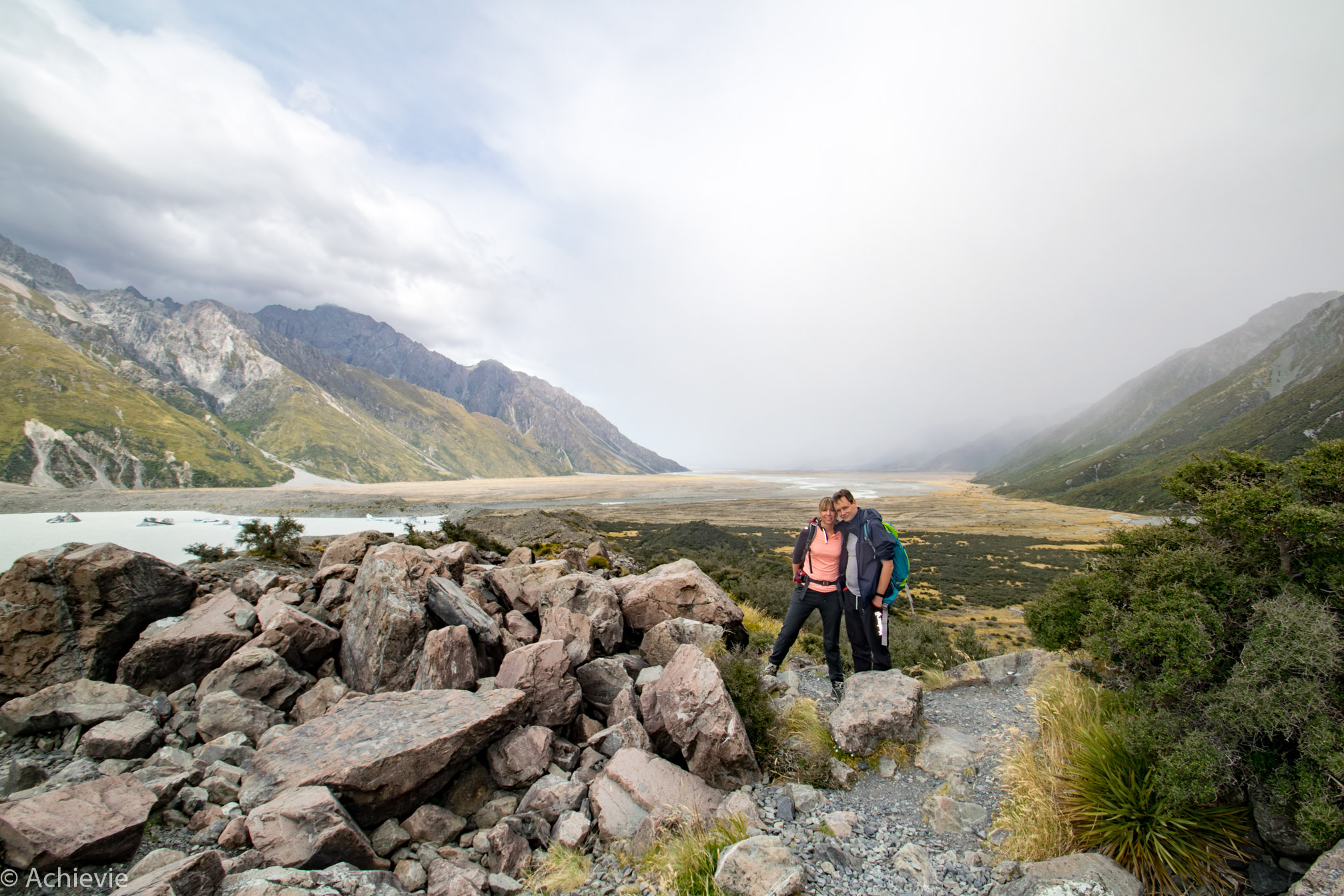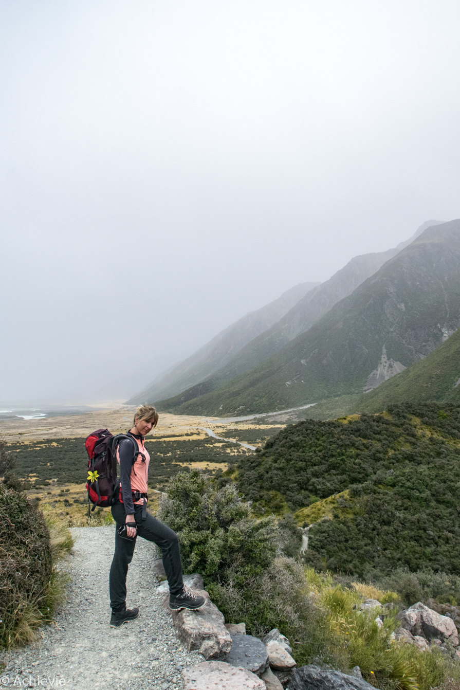 Unfortunately we couldn’t finish the Hooker Valley Track, as the combination of the intense wind and rain made it pretty unpleasant to continue. We did get amazing views of Hooker Valley, Mueller Glacier lake and Mount Cook though. We spent about 2 hours on the track up and down.