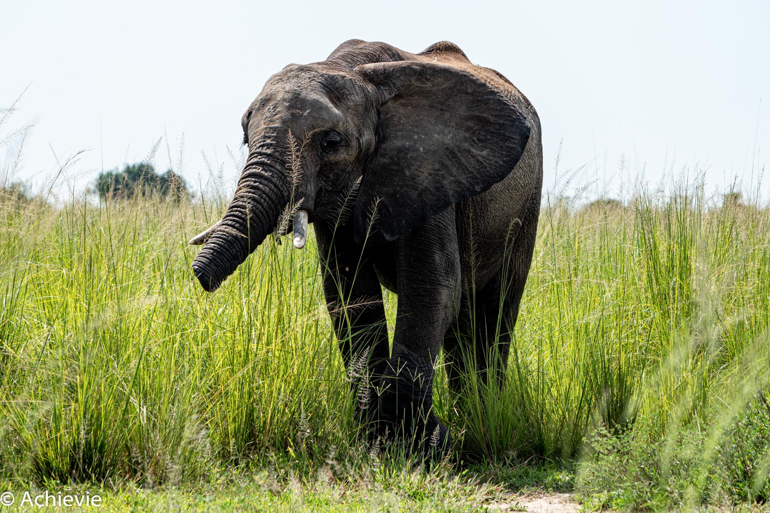 After the Kob Loop there’s a sign of a Lion Loop – nothing on the map though. Certainly not a loop – a one-way road, yes – but not named “Lion Loop” on the map. As we didn’t wanna risk anything, we didn’t take that one and just continued to the south. After a while we saw a sign showing directions to the Murchison Falls on the one hand and Mansebi on the other hand. The latter one seemed to be the right one. But it was so overgrown. At certain times you didn’t even see the road – it was just all plants, bushes and high grasses. Here and there a tree had fallen onto the road, requiring us to go around it through the high grasses. Luckily the roads weren’t too muddy here…