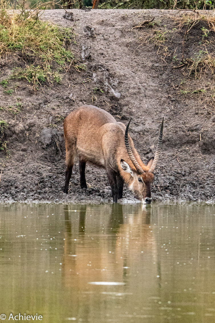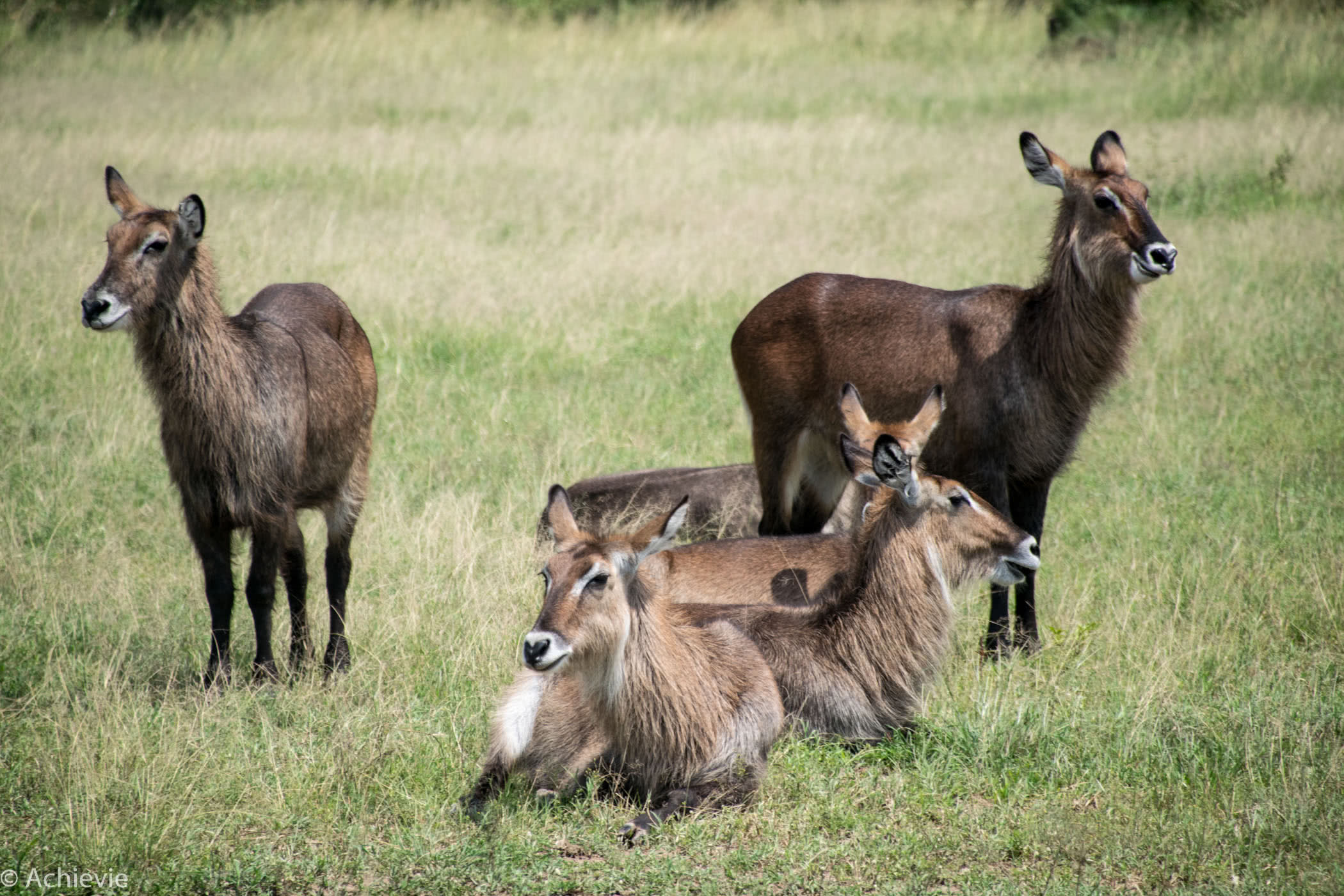 The waterbuck is a large antelope found widely in sub-Saharan Africa. The thirteen subspecies are grouped under two varieties: the common or ellipsen waterbuck and the defassa waterbuck. The long, spiral horns, present only on males, curve backward, then forward and are 55–99 cm (22–39 in) long. Waterbuck are rather sedentary in nature. A gregarious animal, the waterbuck may form herds consisting of six to 30 individuals. Predominantly a grazer, the waterbuck is mostly found on grassland.